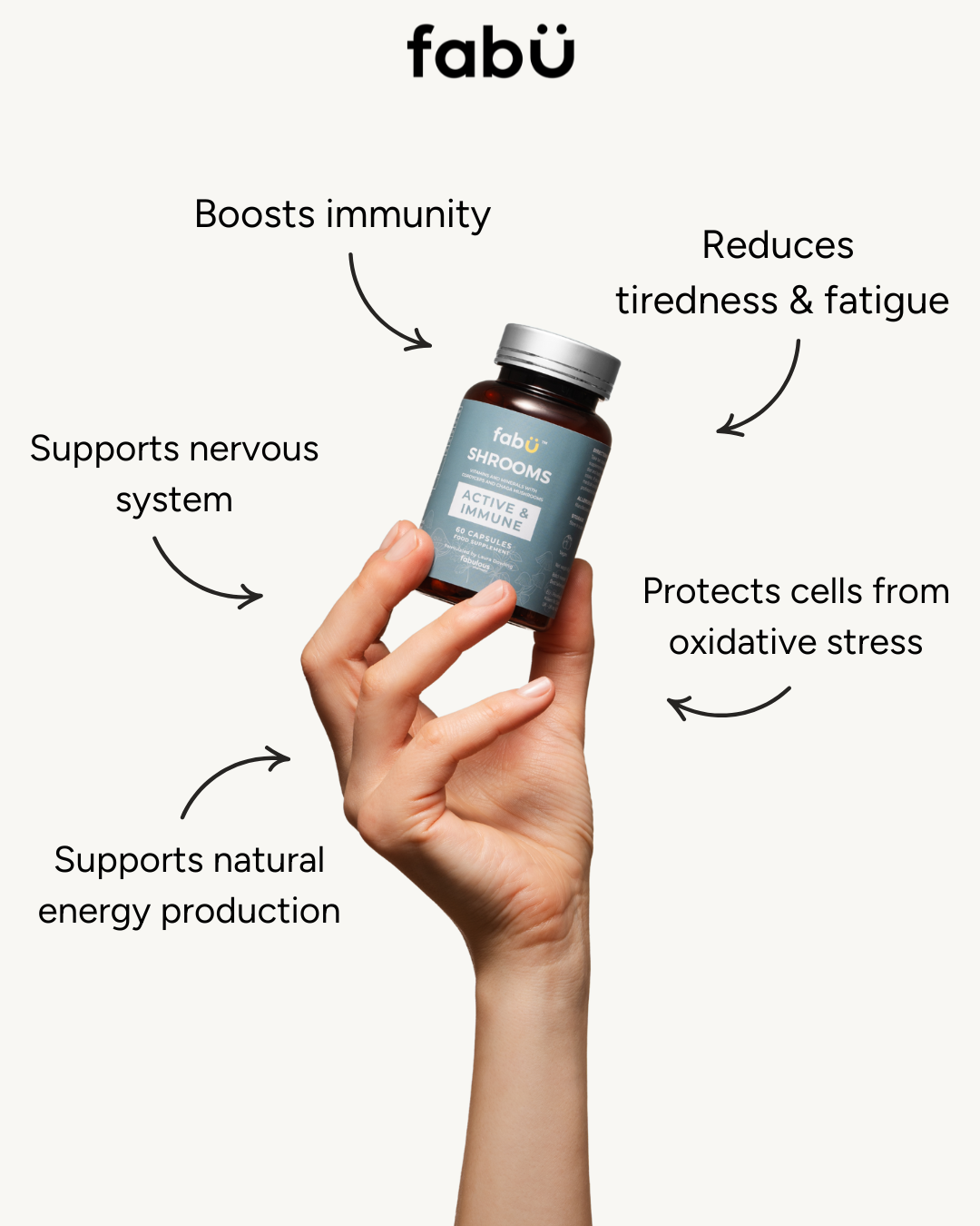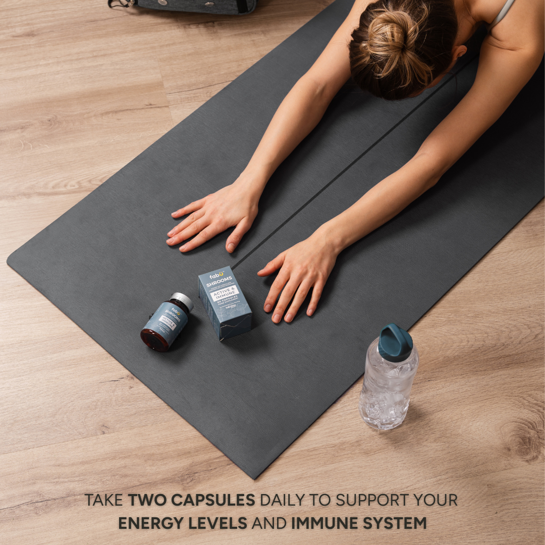 fabÜ SHROOMS ACTIVE & IMMUNE is a unique supplement with six active ingredients. It is based on a concentrated extract of two edible mushrooms, Cordyceps and Chaga blended with vitamin D, Vitamin C, copper and zinc to support your immune system and protect your cells from oxidative stress.